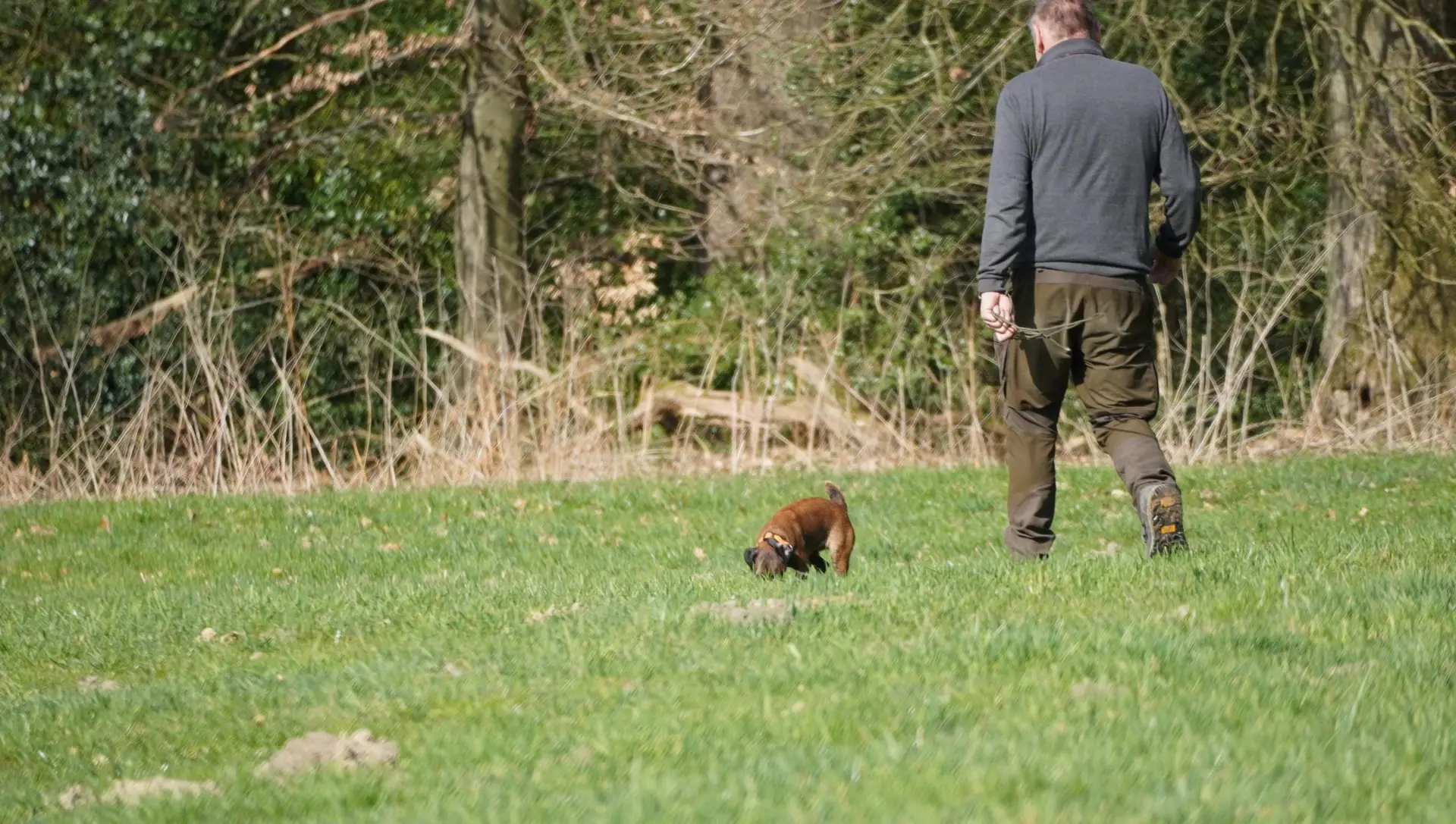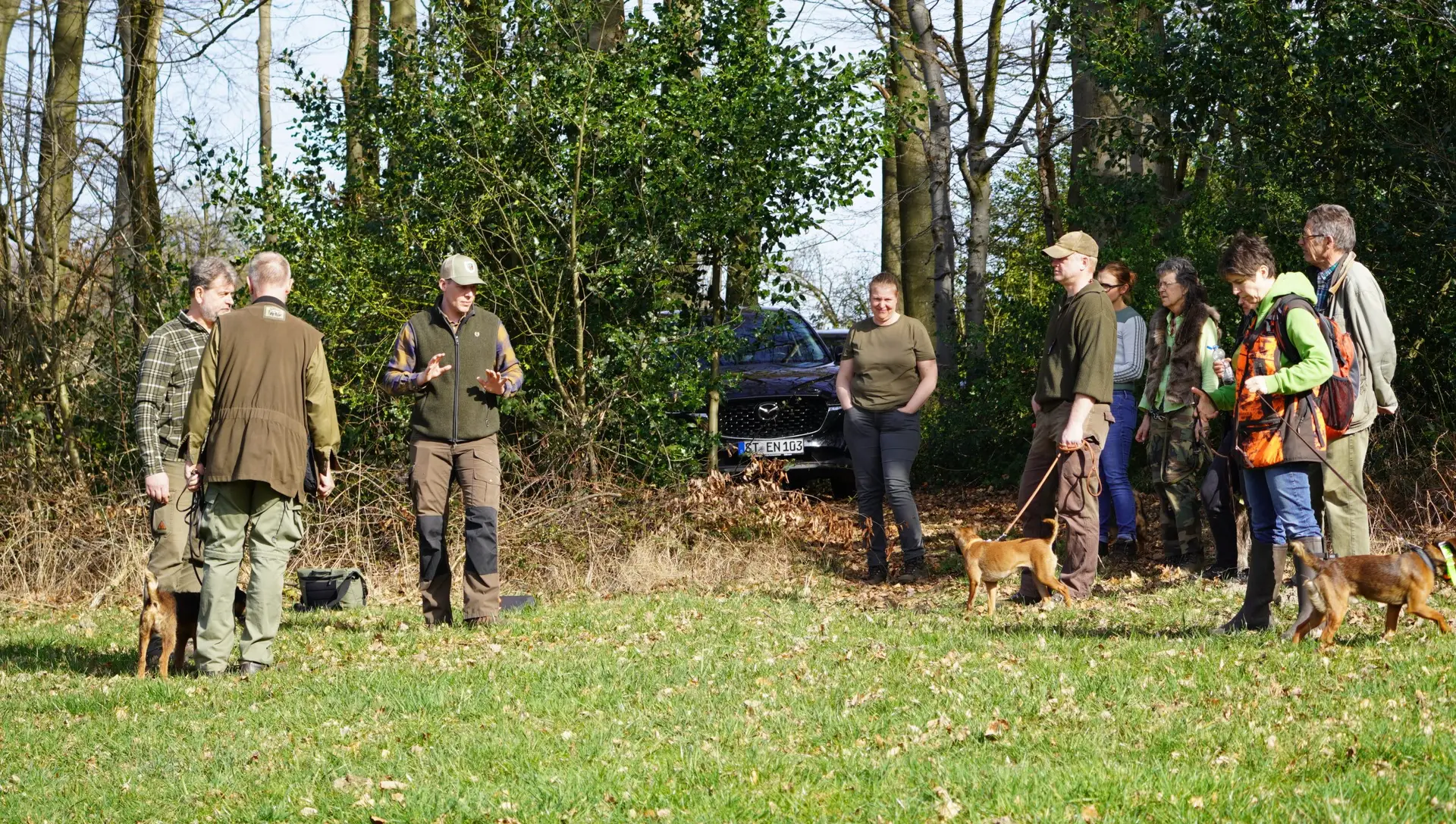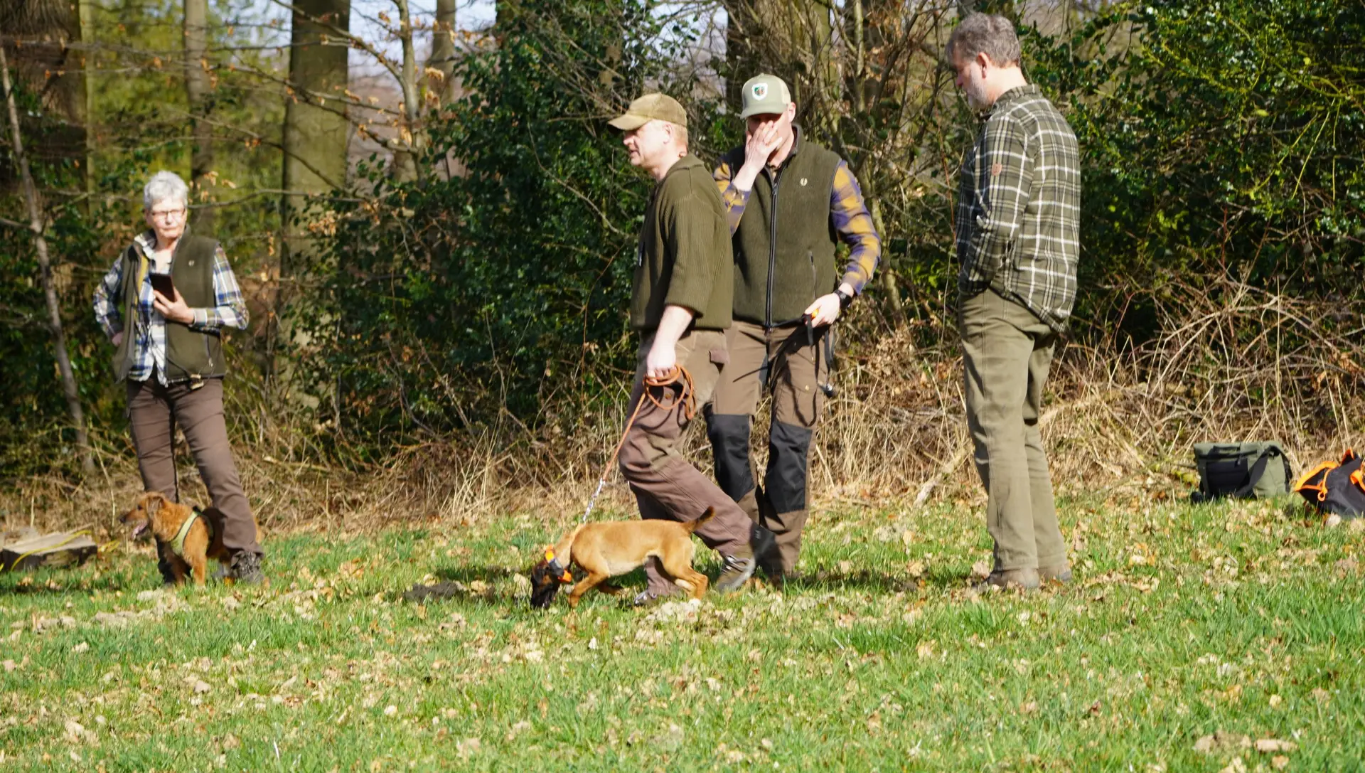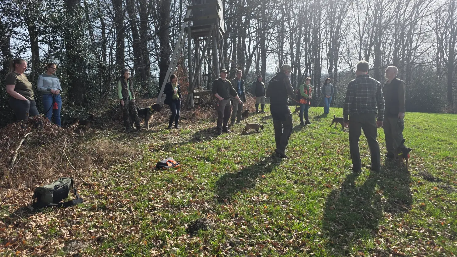 Im von Holger Strüning zur Verfügung gestellten Revier boten sich wieder ausgezeichnete Bedingungen für die Durchführung der Veranstaltung. Zunächst wurden die Hunde mit dem Procedere der Zuchtschaubewertung vertraut gemacht. Im Anschluss konnten die jungen Hunde erste Erfahrungen an einer Schliefenröhre machen. Zum Üben des Ablaufs der Schussfestigkeit ging es auf eine nahegelegene Wiese und auch die Arbeit auf einer Hasenspur wurde dort geübt. Ein großes Lob gab es für alle Hunde, die einen hervorragenden Grundgehorsam zeigten.