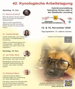Wir möchten Sie auf die Kynologische Arbeitstagung des VDH-Landesverband Baden-Württemberg hinweisen. Dieser richtet am 15. und 16. November 2025 eine Hybridveranstaltung mit Vorträgen von Dr. Markus Eickhoff, Dr. Claudia Binder, Dr. Jan-Peter Bach und Dr. Eberhard Manz aus.